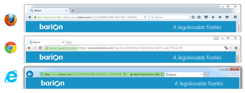 A Barion szervereit a Comodo 2048 bites TLS titkosítása védi. Fizetés előtt mindig ellenőrizd, hogy valóban a Barion biztonságos szerverén adod meg a fizetéshez szükséges bankkártya adatokat vagy jelszót.A böngésződ zöld színnel jelzi,ha a fizetés és a fizetőoldal tulajdonosát Barion Payment Inc [HU] néven azonosítja: